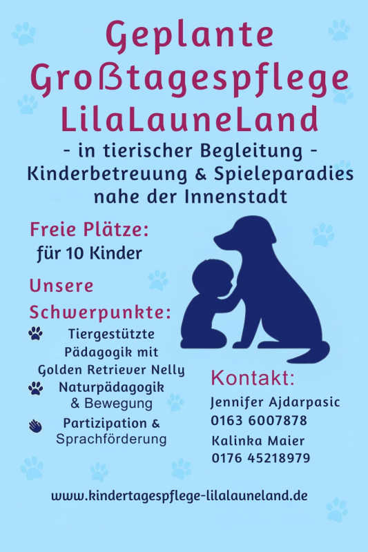 LilaLauneLand steht für eine Kindertagespflege mit Herz, Verstand und einer großen Portion Lebenserfahrung – getragen von unserer Liebe zu Kindern und Tieren.