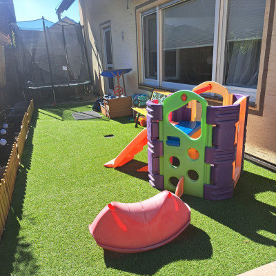 Auf der mit Rasenteppich ausgelegten Terrasse finden die Kinder ein kleines Paradies: Trampolin, Sandkasten, Bobbycars, Roller, Rutsche und ein Kletterturm laden zum Spielen an der frischen Luft ein.